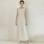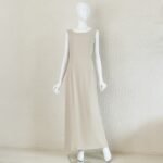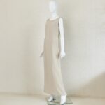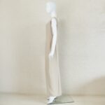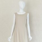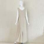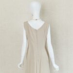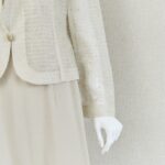 ジャケットはフリルカラーにシルクを使用しており、首元を柔らかく包みます。本体はオーガンジーに花のような刺繍とラメ糸を施し、透け感と煌めきが上品な華やかさ。ウエスト位置にはジルコニアをあしらったフロントボタンをアクセントに優美な印象を与えます。プレーンなノースリーブワンピースはストールやジャケットのコーディネートで着回しが易しく重宝します。ロング丈の後ろ側は美しいドレープができるデザインで、エレガントな装いになります。母親ドレス、きちんとしたいお食事会などフォーマルな着回しに重宝します。