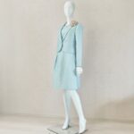 立体的な花柄が浮かび上がるジャガード素材が華やかです。淡いミントグリーンの爽やかな色味が、春夏のフォーマルシーンにぴったり。ジャケットは華奢なシルエットのテーラードデザインで、ひとつボタンが洗練された印象に。身頃には曲線的な切り替えを施し、小さなポケットを添えることで、ウエストラインを美しく引き立てます。ノースリーブワンピースにも、ウエスト部分に立体的な切り替えを加え、タックによってふんわり広がるフレアが可憐です。